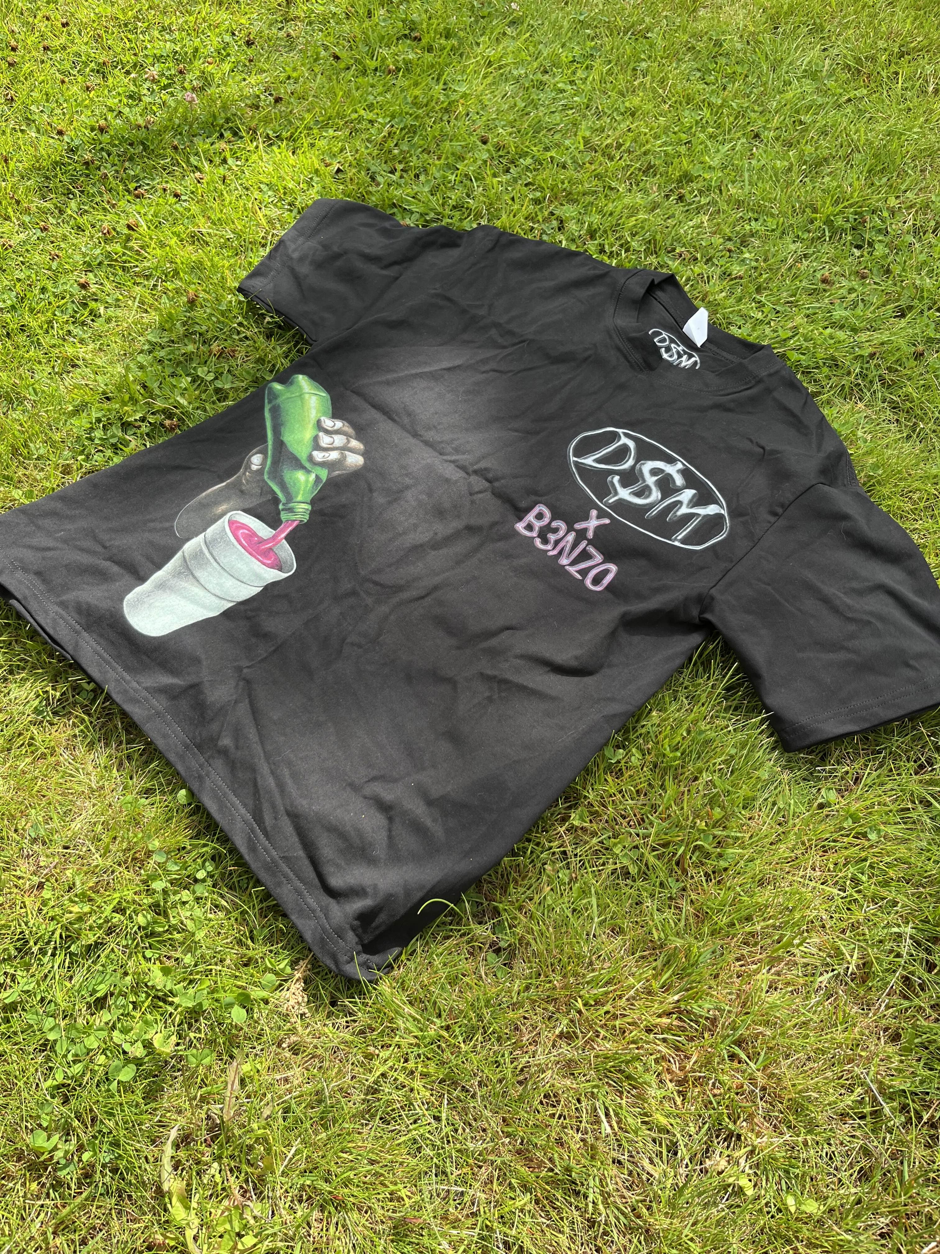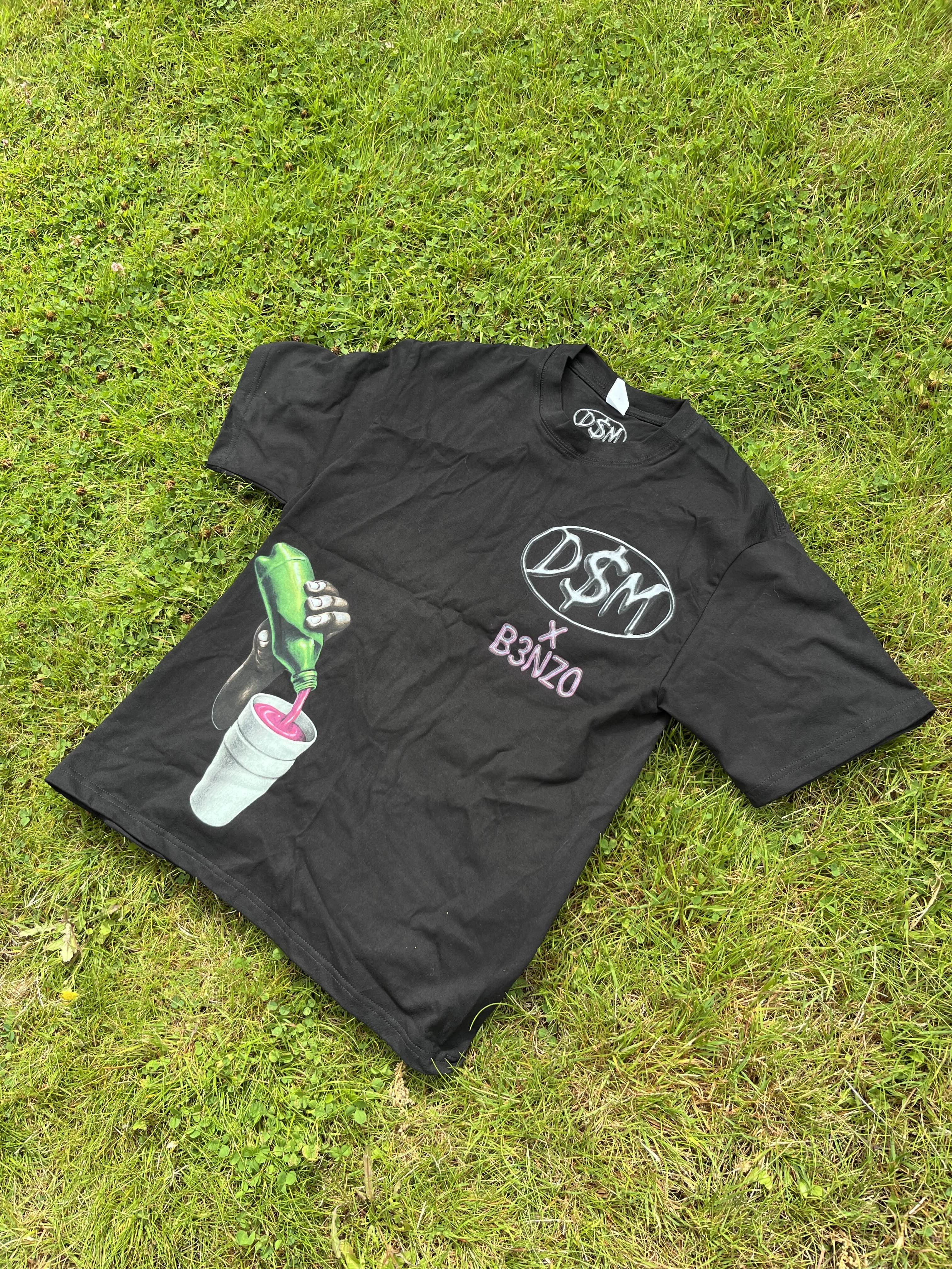 D$M logo stamped on the chest. Pink B3NZO logo underneath — subtle flex. Bottom left a hand pouring up into a double cup. Real recognize real.